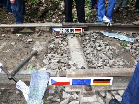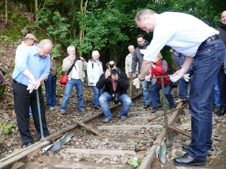 Die Bürgermeister von Sebnitz und Dolni Poustevna ziehen in einem symbolischen Akt die Schrauben am Gleis an.